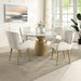 The Kala collection brings a touch of elegance with its round marble-top dining table and warm oak-finish base. Featuring a fixed tabletop, this set pairs beautifully with upholstered chairs that balance comfort and style. The metal chair legs introduce a sleek, modern element, making this collection a chic and functional centerpiece for any dining space.