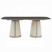 Invite friends and family to enjoy meals together at the Elyssa dining table, a stunning centerpiece for any gathering. This table features a double pedestal base paired with a smooth, rounded-edge tabletop made from sintered stone. The pedestals are lightly padded and beautifully diamond-quilted with synthetic leather, finished in an elegant champagne hue that adds a touch of sophistication. The tabletop showcases a striking variation of veins, offering subtle contrast and visual interest. With ample space, the Elyssa dining table comfortably accommodates up to eight people, making it perfect for both casual meals and special occasions.