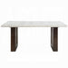 The Edwyn dining set, showcasing a pristine white marble top paired with a rich brown finish, epitomizes elegance and sophistication. Its sturdy double U-shaped base adds a contemporary touch, while the padded seat and back cushions of the chairs ensure comfort during every gathering. Perfect for both casual meals and formal dinners, the Edwyn dining set transforms any dining space into a stylish haven, making it ideal for creating memorable moments with family and friends.