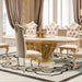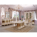 The HD-903 Dining Room Set features a captivating gold and cream finish that leaves a lasting impression on your guests. It is adorned with ornate carvings on its pedestal base and an oval tabletop with scrolled details. Accompanying the table are six exquisite chairs upholstered in soft creamy fabric, embellished with elegant nail head trims for added sophistication.